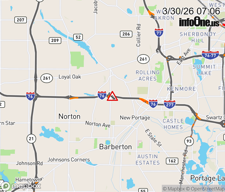 The left lane is blocked on I-76/US-224 West at Barber Rd, due to repairs/maintenance. ![]() |