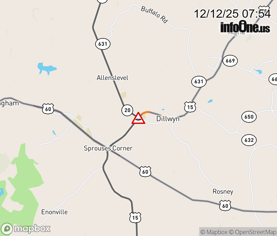 On US-15 North in the County of Buckingham, in the vicinity of Main St; S Constitution Rte; Rt. 1003E/W (Buckingham County); VA-20N/S, motorists can expect delays due to a vehicle crash. Lane closures exist. ![]() |