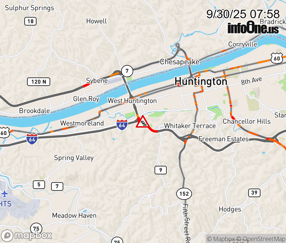 In Cabell County there is a Congestion-Delay on I-64W at Mile Marker 6.6. ![]() |