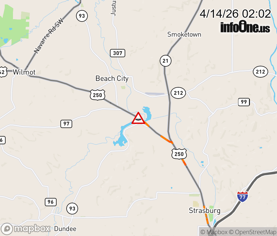 US-250 CLOSED in BOTH DIRECTIONS 0.4 miles beyond SR-93 (MM: 1), due to crash. Use alternate route. Updated: Tue 4/14/26 2:02 AM EDT ![]() Updated: Tue 4/14/26 2:02 AM EDT |