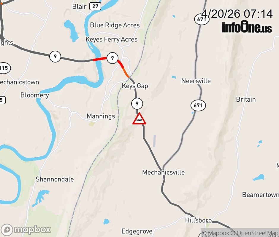 On VA-9 in the County of Loudoun, in the vicinity of Sagle Rd; Rt. 687E/W (Loudoun County), motorists can expect delays due to a vehicle crash. The east through lanes are closed. Updated: Mon 4/20/26 7:14 AM EDT ![]() Updated: Mon 4/20/26 7:14 AM EDT |