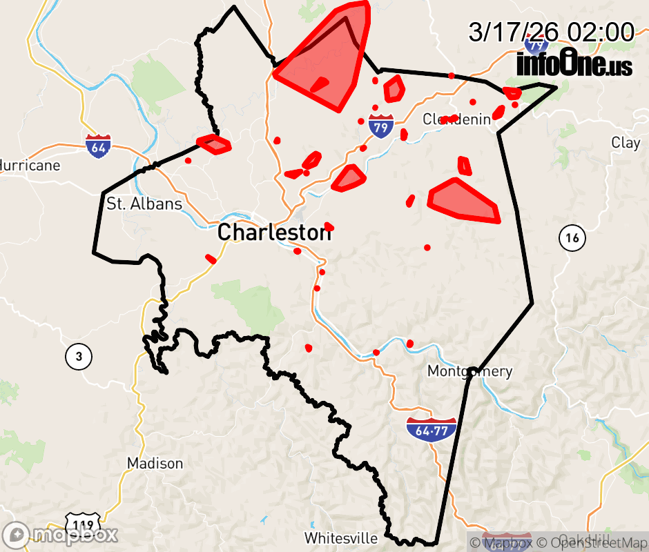 Kanawha County has 34 power outages affecting 1775 customers. Appalachian Power 1775 without power Elkview: Customers affected: 682 (12%) Estimated repair: Tue 9:00 PM Charleston: Customers affected: 820 (31%) Estimated repair: Tue 9:00 PM Clendenin: Customers affected: 254 (9%) Estimated repair: Tue 9:00 PM Alum Creek: Customers affected: 106 (9%) Estimated repair: Tue 9:00 PM Nitro: Customers affected: 28 (1%) Estimated repair: Tue 12:00 PM Glasgow: Customers affected: 22 (5%) Estimated repair: Tue 9:00 PM An additional 2 communities have outages affecting 8 customers. Updated: Tue 3/17/26 2:00 AM EDT ![]() Updated: Tue 3/17/26 2:01 AM EDT |