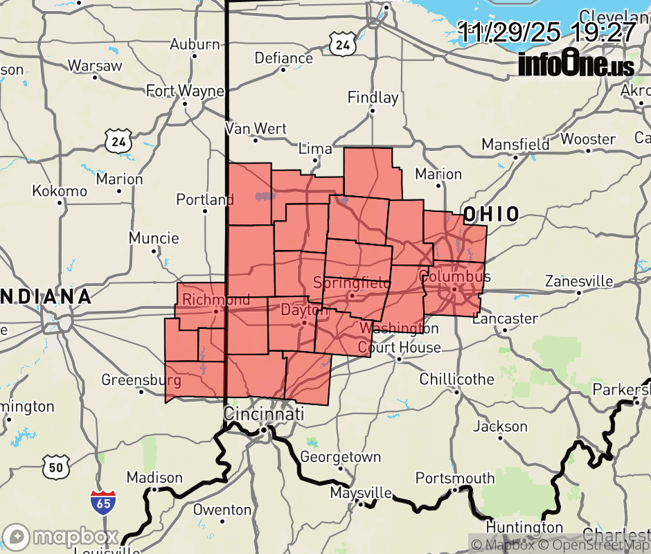 Canceled 11/30/25 12:35 AM Winter Weather Advisory issued November 29 at 7:26PM EST until November 30 at 9:00AM EST by NWS Wilmington OH * WHAT... Snow. Additional snow accumulations up to two inches. Winds gusting as high as 35 mph. * WHERE... Portions of East Central and Southeast Indiana and Central, Southwest, and West Central Ohio. * WHEN... Until 9 AM EST Sunday. * IMPACTS... Roads, and especially bridges and overpasses, will likely become slick and hazardous. Plan on slippery road conditions. ![]() |