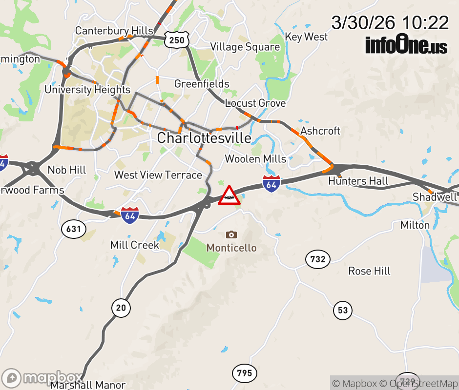 On I-64 at mile marker 122.4 in the County of Albemarle, motorists can expect delays due to a vehicle crash. The east right shoulder is closed. Updated: Mon 3/30/26 10:22 AM EDT ![]() Updated: Mon 3/30/26 10:22 AM EDT |