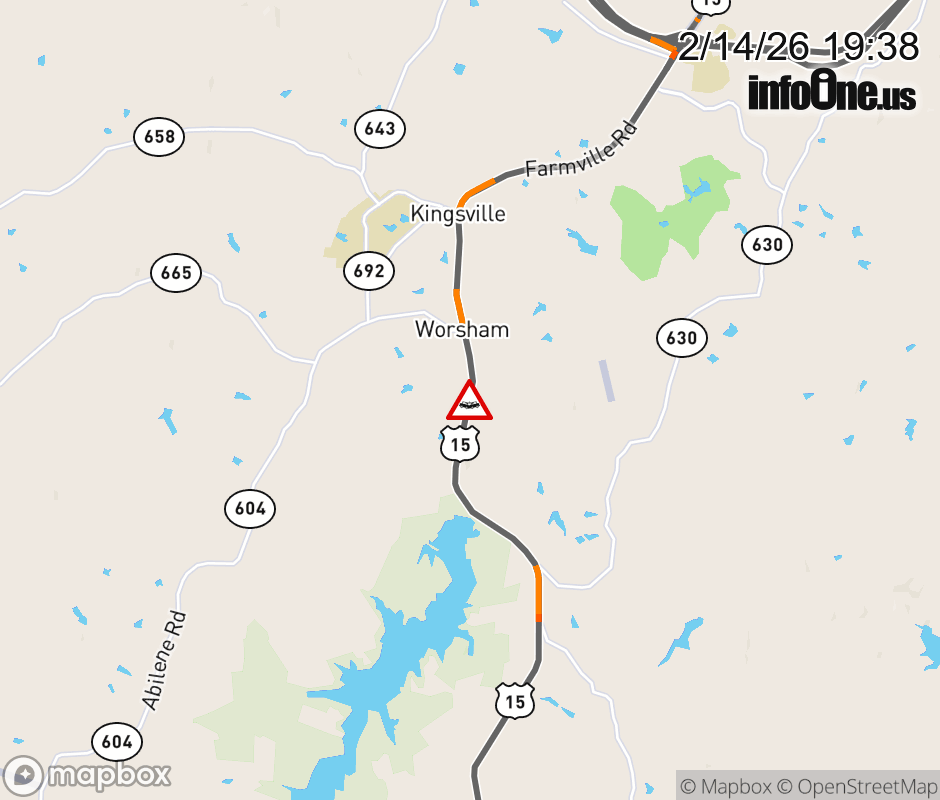 On US-15 North in the County of Prince Edward, in the vicinity of Abilene Rd; Worsham Rd; Rt. 665E/W (Prince Edward County), motorists can expect delays due to a vehicle crash. Lane closures exist. ![]() |
