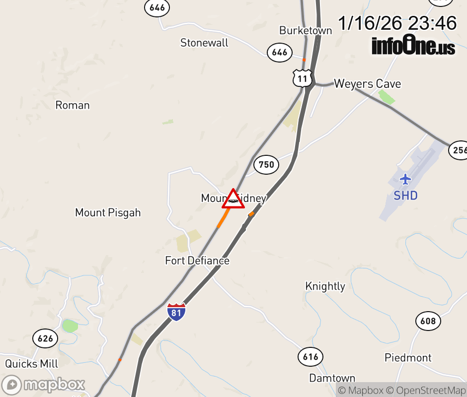 On US-11 North in the County of Augusta, in the vicinity of Lafayette St; Seawright Springs Rd; Rt. 626N/S (Augusta County), motorists can expect delays due to a vehicle crash. Updated: Fri 1/16/26 11:46 PM EST ![]() Updated: Fri 1/16/26 11:46 PM EST |