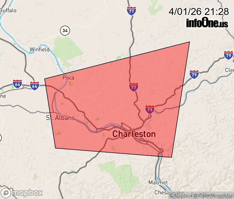 Canceled 4/1/26 9:40 PM Severe Thunderstorm Warning issued April 1 at 9:27PM EDT until April 1 at 10:00PM EDT by NWS Charleston WV SVRRLX The National Weather Service in Charleston West Virginia has issued a * Severe Thunderstorm Warning for... East central Putnam County in western West Virginia... Northwestern Kanawha County in central West Virginia... * Until 1000 PM EDT. * At 926 PM EDT, a severe thunderstorm was located over St. Albans, or near Nitro, moving east at 25 mph. HAZARD...60 mph wind gusts and quarter size hail. SOURCE...Radar indicated. IMPACT...Hail damage to vehicles is expected. Expect wind damage to roofs, siding, and trees. * Locations impacted include... Charleston, Nitro, Jefferson, South Charleston, St. Albans, Dunbar, Sissonville, Poca, Cross Lanes, Institute, Tornado, Coal Fork, and Teays Valley. This includes the following highways... Interstate 79 between mile markers 1 and 9. Interstate 77 in West Virginia between mile markers 96 and 113. Interstate 64 in West Virginia between mile markers 42 and 57. West Virginia Turnpike between mile markers 94 and 95. Route 119 between mile markers 74 and 80. ![]() |