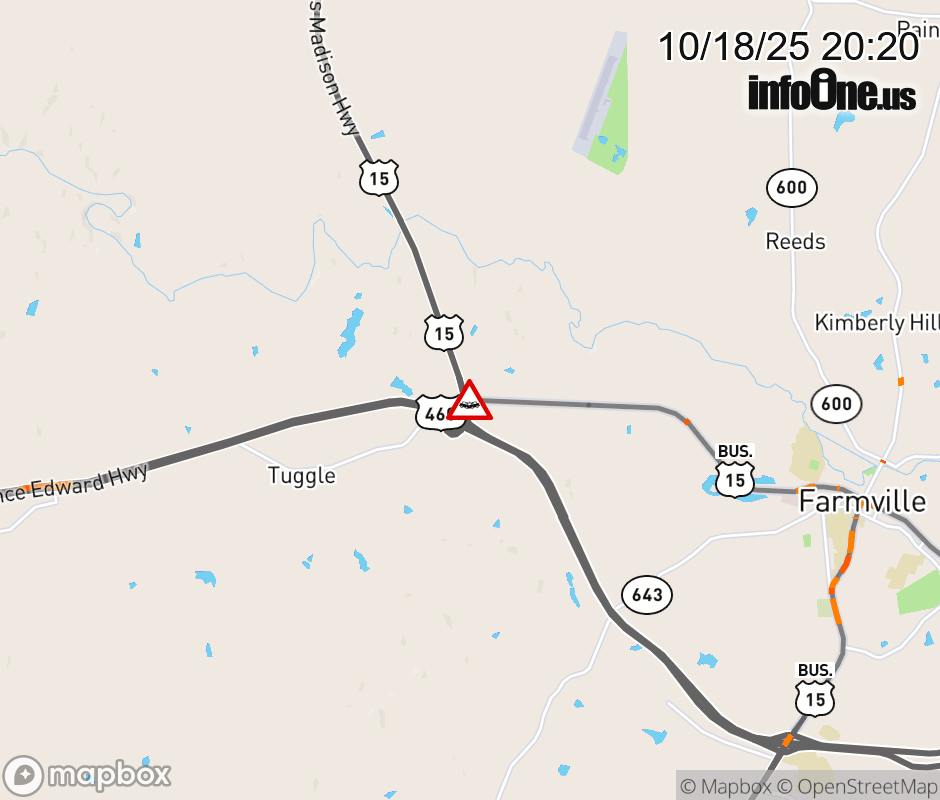 On BUS US-15 in the County of Prince Edward, in the vicinity of Sheppards Rd; W Third St; US-15N, BUS US-460E (12 Farmville/Prince Edward); US-15N/S; US-15S, BUS US-460W (12 Farmville/Prince Edward), motorists can expect delays due to a vehicle crash. All north lanes are closed. ![]() |