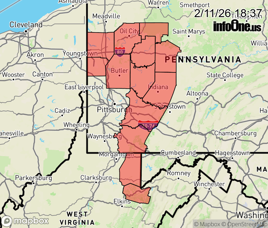 Canceled 2/12/26 6:00 AM Special Weather Statement issued February 11 at 6:35PM EST by NWS Pittsburgh PA Upslope snow showers along the higher elevations of western Pennsylvania and northern West Virginia can impact area travel through Thursday. Some instances of snow north of Allegheny County will also be possible. Some of these showers may be moderate in intensity at times and can reduce visibility and lead to accumulation on roadways. Total accumulations between 1-3 inches are expected with localized amounts approaching 4 inches possible, mainly along west-facing slopes. ![]() |