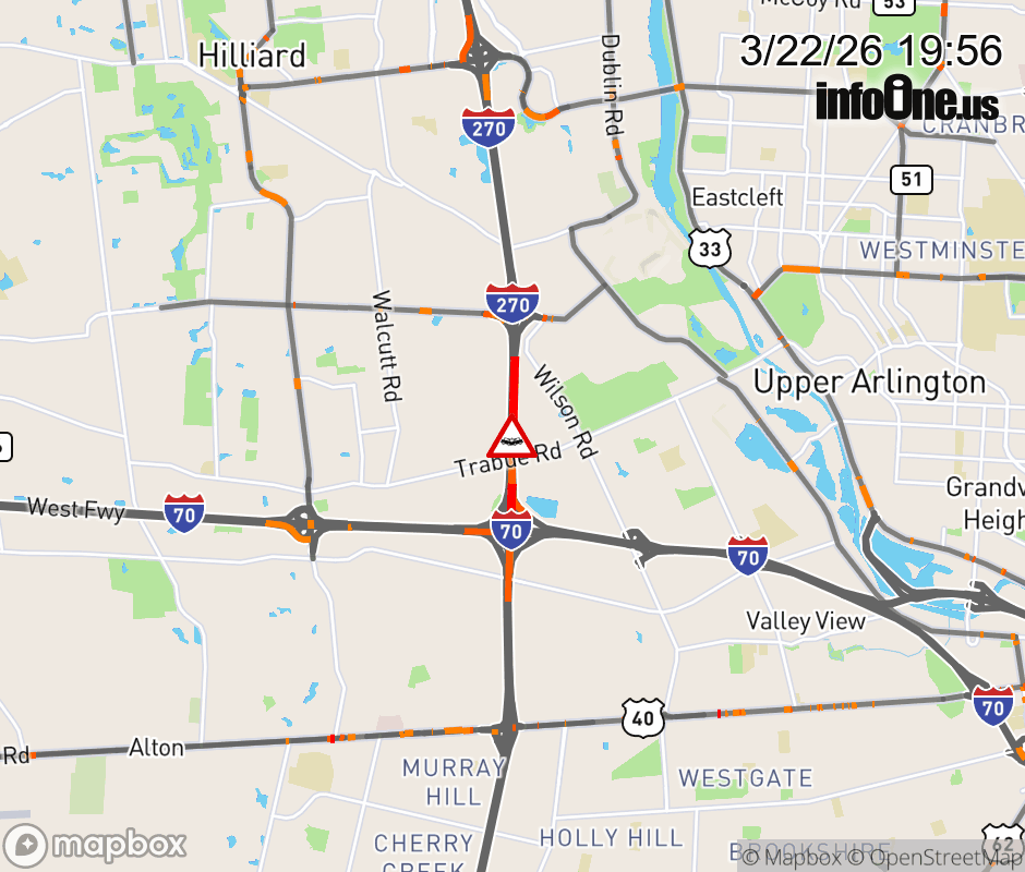 The right lane is closed on I-270 North beyond I-70, due to a crash. Updated: Sun 3/22/26 7:56 PM EDT ![]() Updated: Sun 3/22/26 7:56 PM EDT |