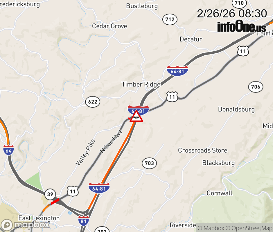 On I-81 at mile marker 195 in the County of Rockbridge, motorists can expect delays due to a tractor trailer crash. The south entrance ramp is closed. Updated: Thu 2/26/26 8:30 AM EST ![]() Updated: Thu 2/26/26 8:30 AM EST |