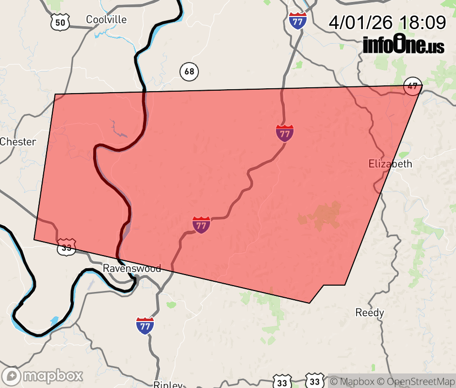 Canceled 4/1/26 6:32 PM Severe Thunderstorm Warning issued April 1 at 6:08PM EDT until April 1 at 7:00PM EDT by NWS Charleston WV SVRRLX The National Weather Service in Charleston West Virginia has issued a * Severe Thunderstorm Warning for... East central Meigs County in southeastern Ohio... Western Wirt County in northwestern West Virginia... Northeastern Jackson County in northwestern West Virginia... Southwestern Wood County in northwestern West Virginia... * Until 700 PM EDT. * At 608 PM EDT, a severe thunderstorm was located near Forked Run State Park, moving east at 30 mph. HAZARD...Quarter size hail. SOURCE...Radar indicated. IMPACT...Damage to vehicles is expected. * Locations impacted include... Elizabeth, Forked Run State Park, Ravenswood, Portland, Peewee, Belleville, Reedsville, Greencastle, Morristown, and Rockport. This includes Interstate 77 in West Virginia between mile markers 148 and 166. ![]() |