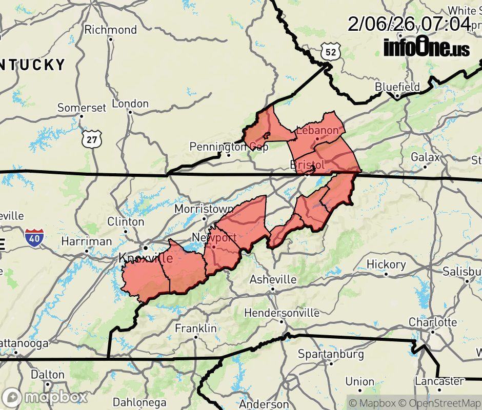 Canceled 2/6/26 12:37 PM Winter Weather Advisory issued February 6 at 7:02AM EST until February 7 at 7:00AM EST by NWS Morristown TN * WHAT... Snow expected. Total snow accumulations 2 to 4 inches for elevations at or above 2500 feet, with up to 6 inches possible on the highest mountain peaks. * WHERE... Portions of east Tennessee and southwest Virginia. * WHEN... From 1 PM this afternoon to 7 AM EST Saturday. * IMPACTS... Plan on slippery road conditions. The hazardous conditions could impact the Friday evening commute. ![]() |