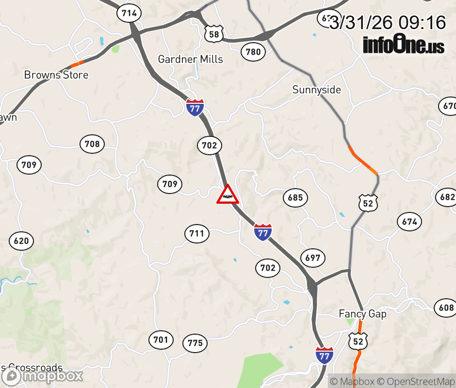 On I-77 at mile marker 11.3 in the County of Carroll, motorists can expect delays due to a tractor trailer crash. The south right shoulder is closed. Updated: Tue 3/31/26 9:16 AM EDT ![]() Updated: Tue 3/31/26 9:16 AM EDT |