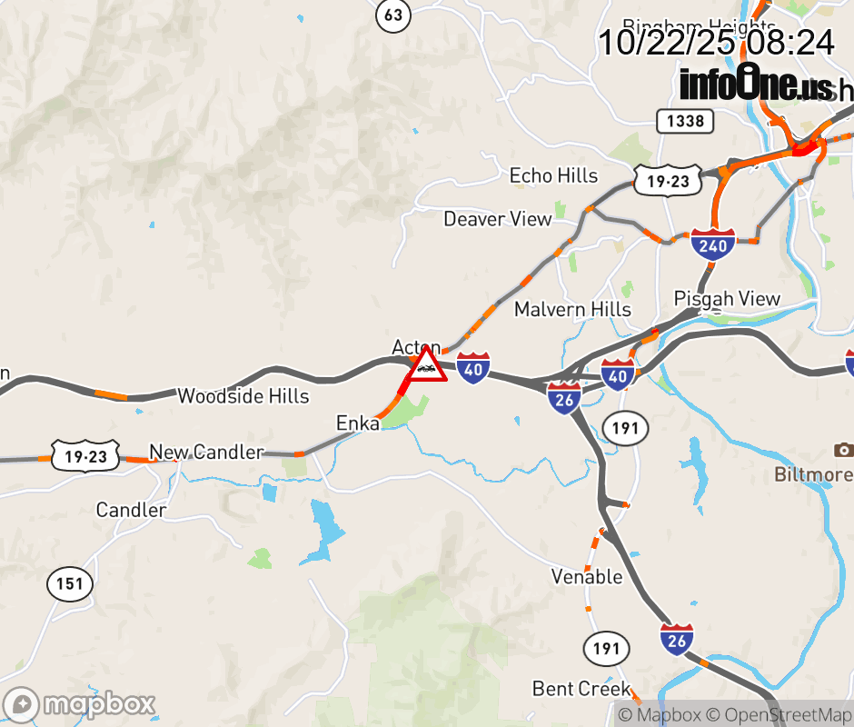 The right shoulder is closed near Exit 44, US 19/US 23/IUS 74 Alternate (Smokey Park Highway). Updated: Wed 10/22/25 8:24 AM EDT ![]() Updated: Wed 10/22/25 8:24 AM EDT |
