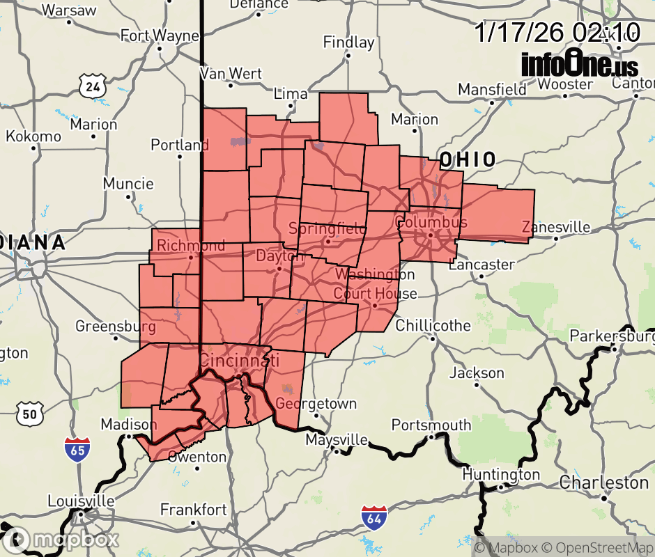 Canceled 1/17/26 8:00 AM Special Weather Statement issued January 17 at 2:09AM EST by NWS Wilmington OH Scattered snow showers will move across the region this morning into early afternoon. Some slick spots will be possible with rapidly changing road conditions and a sudden drop in visibility. If traveling remain alert for changing road conditions and slick spots. ![]() |