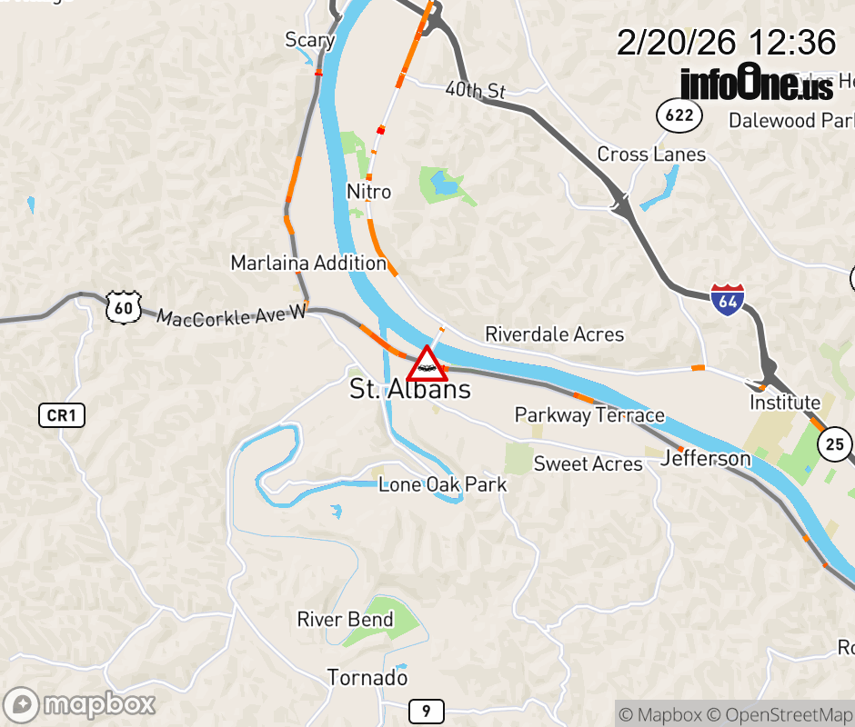 Vehicle Crash on US-60W at WV 25 SPUR. The westbound road is closed. Updated: Fri 2/20/26 12:36 PM EST ![]() Updated: Fri 2/20/26 12:36 PM EST |