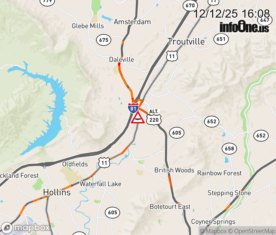 On US-11 in the County of Botetourt, in the vicinity of Olde Rt 604; Rt. 811E/W (Botetourt County), motorists can expect delays due to a vehicle crash. The north right lane and right shoulder are closed.