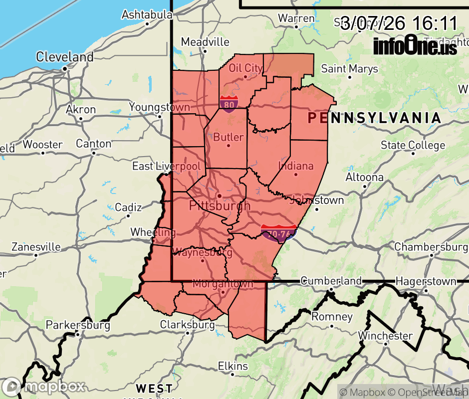 Canceled 3/7/26 4:43 PM Tornado Watch issued March 7 at 4:09PM EST until March 7 at 8:00PM EST by NWS Pittsburgh PA TORNADO WATCH 25 REMAINS VALID UNTIL 8 PM EST THIS EVENING FOR THE FOLLOWING AREAS IN PENNSYLVANIA THIS WATCH INCLUDES 15 COUNTIES IN NORTHWEST PENNSYLVANIA FOREST MERCER VENANGO IN SOUTHWEST PENNSYLVANIA ALLEGHENY FAYETTE GREENE WASHINGTON WESTMORELAND IN WEST CENTRAL PENNSYLVANIA ARMSTRONG BUTLER CLARION INDIANA JEFFERSON PA IN WESTERN PENNSYLVANIA BEAVER LAWRENCE IN WEST VIRGINIA THIS WATCH INCLUDES 8 COUNTIES IN NORTHEAST WEST VIRGINIA PRESTON IN NORTHERN WEST VIRGINIA MARION MONONGALIA WETZEL IN THE NORTHERN PANHANDLE OF WEST VIRGINIA BROOKE HANCOCK MARSHALL OHIO THIS INCLUDES THE CITIES OF ALIQUIPPA, AMBRIDGE, BEAVER FALLS, BROOKVILLE, BUTLER, CANONSBURG, CLARION, CONNELLSVILLE, ELLWOOD CITY, FAIRMONT, FOLLANSBEE, FORD CITY, FRANKLIN, GREENSBURG, GROVE CITY, HERMITAGE, INDIANA, KINGWOOD, KITTANNING, LATROBE, MASONTOWN, MONACA, MORGANTOWN, MOUNDSVILLE, MURRYSVILLE, NEW CASTLE, NEW KENSINGTON, NEW MARTINSVILLE, OIL CITY, PITTSBURGH METRO AREA, PUNXSUTAWNEY, SHARON, TERRA ALTA, TIONESTA, UNIONTOWN, WASHINGTON, WAYNESBURG, WEIRTON, WELLSBURG, AND WHEELING. ![]() |