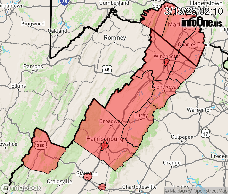 Canceled 3/13/26 10:12 AM Wind Advisory issued March 13 at 2:08AM EDT until March 13 at 8:00PM EDT by NWS Baltimore MD/Washington DC * WHAT... Southwest winds 20 to 25 mph with gusts up to 50 mph expected. * WHERE... Portions of northwest and western Virginia and panhandle West Virginia. * WHEN... From 11 AM this morning to 8 PM EDT this evening. * IMPACTS... Gusty winds will blow around unsecured objects. Tree limbs could be blown down and a few power outages may result. ![]() |