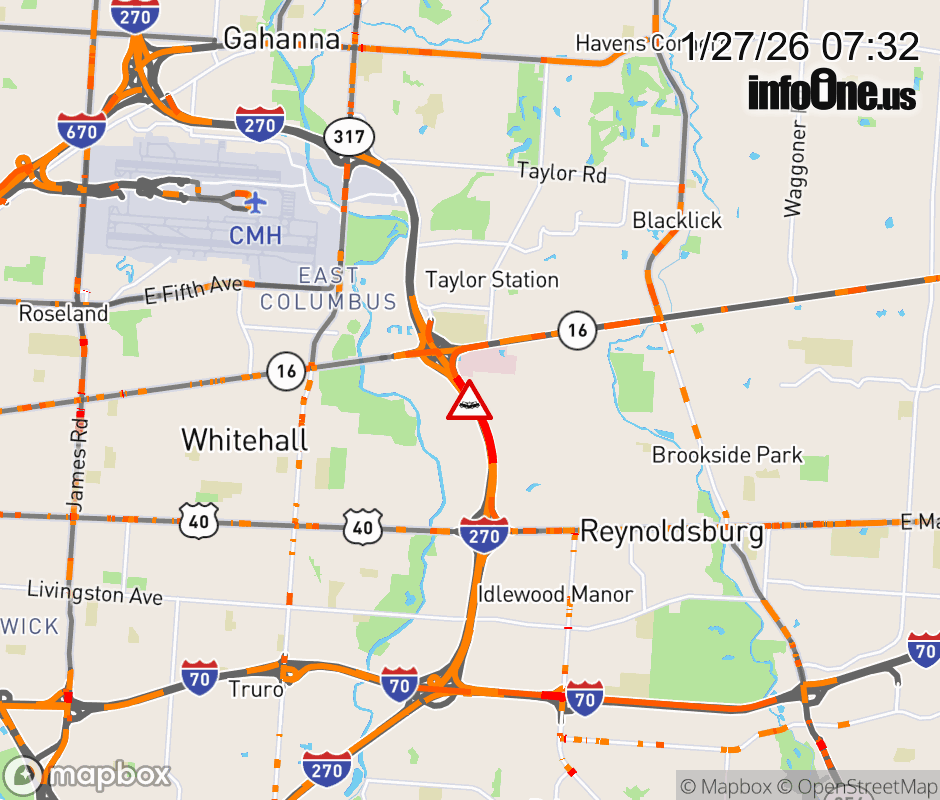 Ramp to SR-16/Broad St from I-270 North is blocked due to crash. Updated: Tue 1/27/26 7:32 AM EST ![]() Updated: Tue 1/27/26 7:32 AM EST |