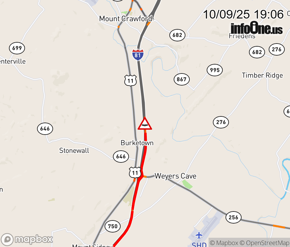 On I-81 North at mile marker 236.8 in the County of Augusta, motorists can expect delays due to a multi-vehicle crash. Traffic backups are approximately 2.5 miles. Updated: Thu 10/9/25 7:06 PM EDT ![]() Updated: Thu 10/9/25 7:06 PM EDT |