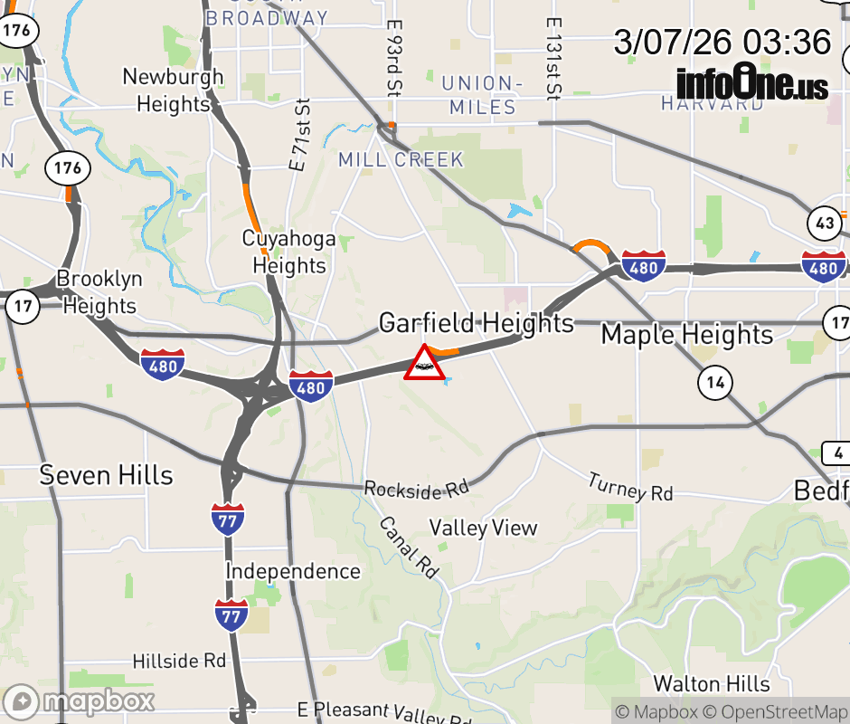 The 2 left lanes are blocked on I-480 East beyond Transportation Blvd/E 98th St, due to a crash. Updated: Sat 3/7/26 3:36 AM EST ![]() Updated: Sat 3/7/26 3:36 AM EST |