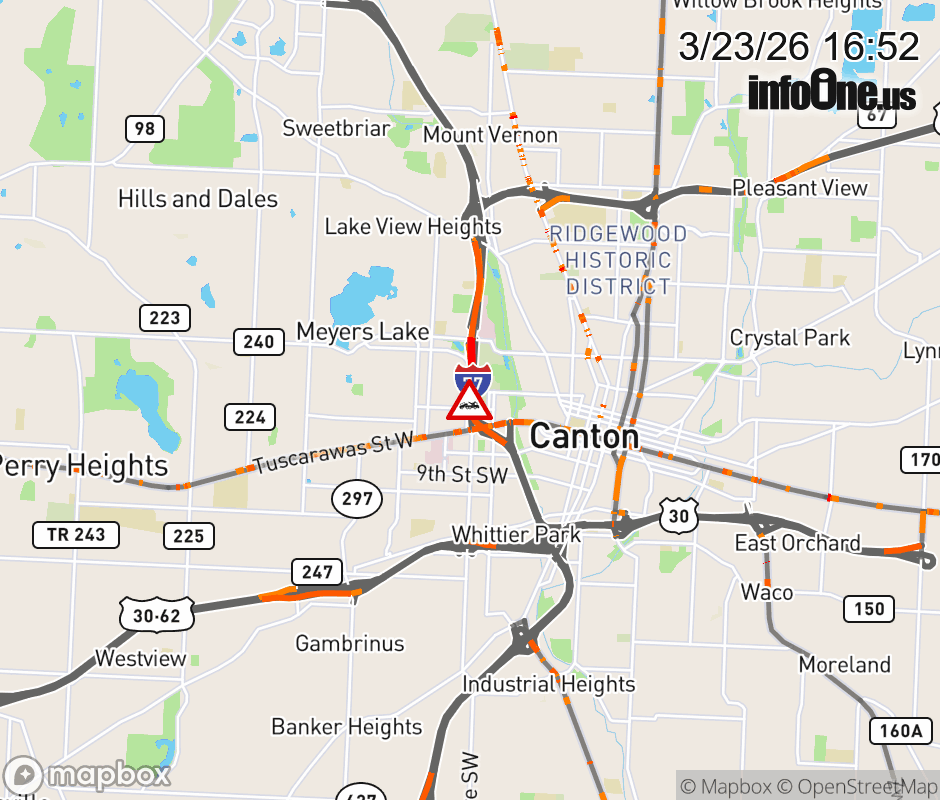 All lanes are blocked on I-77 South/US-62 West at SR-172/Tuscarawas St, due to a disabled vehicle. Updated: Mon 3/23/26 4:52 PM EDT ![]() Updated: Mon 3/23/26 4:52 PM EDT |