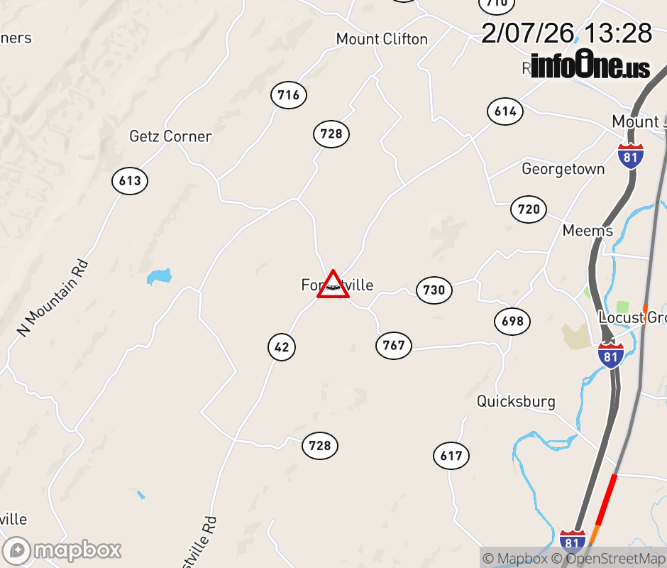 On Rt. 614 in the County of Shenandoah, in the vicinity of Quicksburg Rd; Senedo Rd; Rt. 767E/W (Shenandoah County); VA-42N/S, motorists can expect delays due to a vehicle crash. All south lanes are closed. Updated: Sat 2/7/26 1:28 PM EST ![]() Updated: Sat 2/7/26 1:28 PM EST |