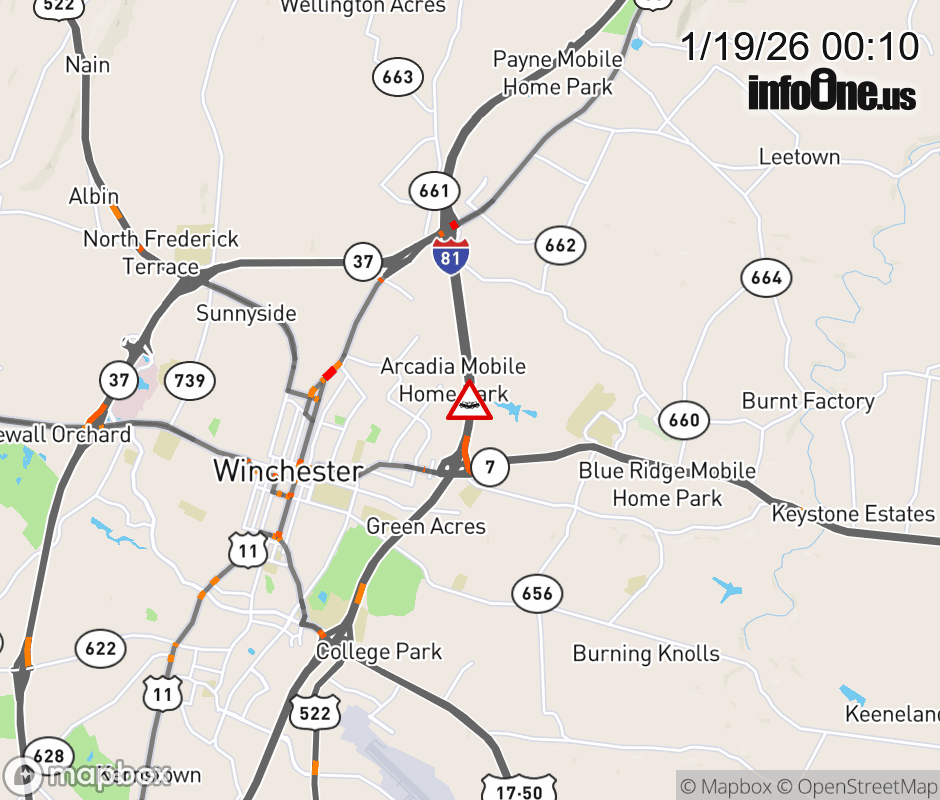 On I-81 at mile marker 316.2 in the County of Frederick, motorists can expect delays due to a vehicle crash. The south right shoulder is closed. Updated: Mon 1/19/26 12:10 AM EST ![]() Updated: Mon 1/19/26 12:10 AM EST |