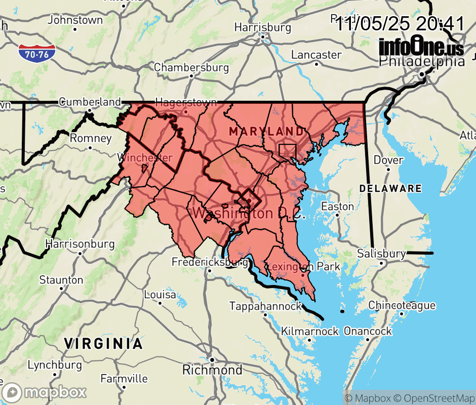 Canceled 11/6/25 12:30 AM Special Weather Statement issued November 5 at 8:35PM EST by NWS Baltimore MD/Washington DC As a cold front sweeps across the area this evening, a surge of strong west-northwest winds will follow. The strongest gusts, potentially reaching 40 to 50 mph in spots, will generally last an hour or less at any given location. Even so, gusts of this magnitude are capable of blowing around lightweight objects, causing localized minor tree damage and power outages, and creating difficult driving conditions for high profile vehicles. The strong wind gusts will reach... The northern Shenandoah Valley and northern Maryland through 1000 PM... The Baltimore and Washington metropolitan areas between 930 PM and 1100 PM... Southern Maryland between 1030 PM and 1230 AM. ![]() |