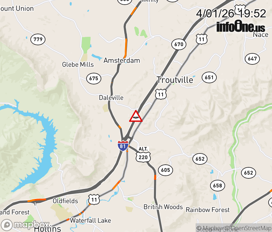On I-81 South at mile marker 151.2 in the County of Botetourt, motorists can expect delays due to a tractor trailer crash. Updated: Wed 4/1/26 7:52 PM EDT ![]() Updated: Wed 4/1/26 7:52 PM EDT |