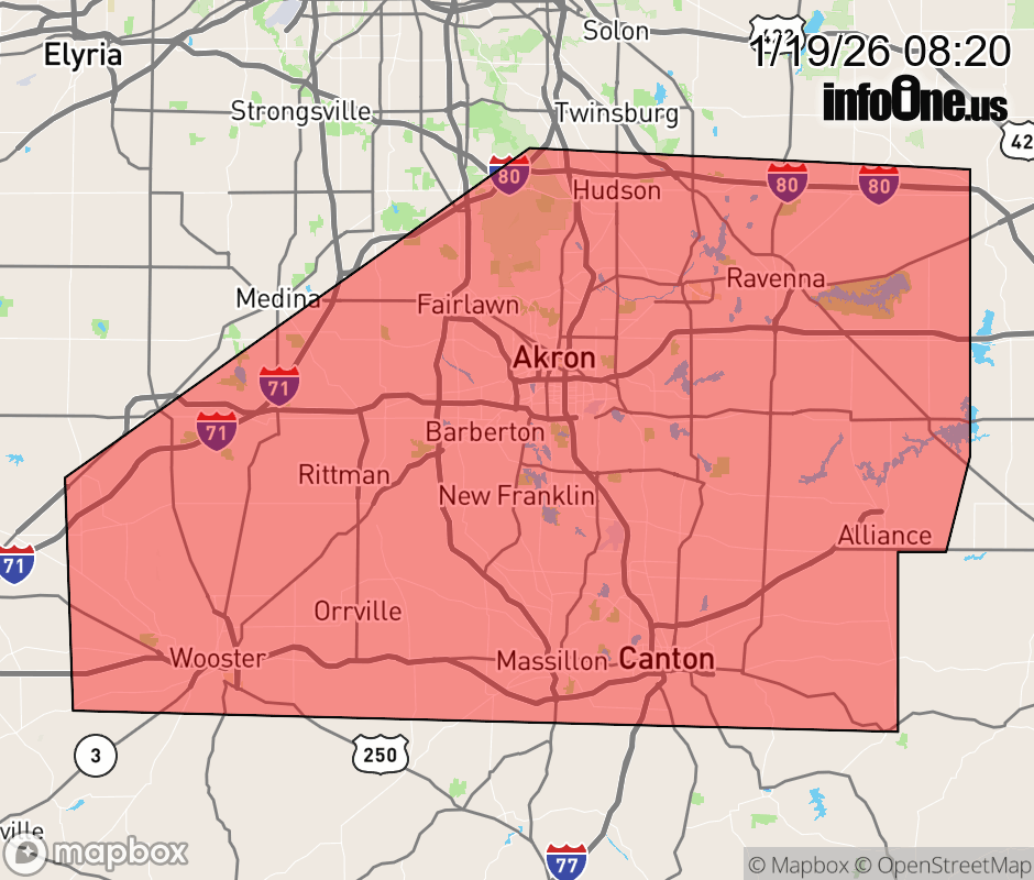 Canceled 1/19/26 9:15 AM Special Weather Statement issued January 19 at 8:19AM EST by NWS Cleveland OH At 815 AM EST, radar indicated snow shower extending from Wadsworth to Akron, moving northeast at 40 mph. HAZARDS INCLUDE... Winds to 30 mph... Visibility dropping to less than a half mile... Up to 1 inch of quick snow accumulation... Locations impacted include... Akron, Medina, Wooster, Ravenna, Cuyahoga Falls, Kent, Barberton, Green, Alliance, Hudson, Wadsworth, Tallmadge, North Canton, Streetsboro, Louisville, Orrville, Rittman, and Sebring. Use extra caution if you must travel. Rapid changes in visibility and potentially slick roads may lead to accidents. ![]() |