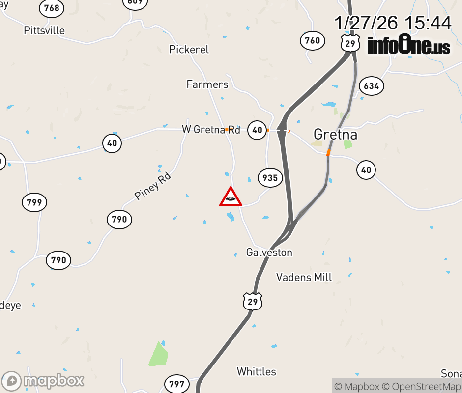 On Rt. 791 in the County of Pittsylvania, in the vicinity of Cotton Patch Rd; Rt. 672N/S (Pittsylvania County), motorists can expect delays due to a tractor trailer crash. All east lanes are closed. All west lanes are closed. Updated: Tue 1/27/26 3:44 PM EST ![]() Updated: Tue 1/27/26 3:44 PM EST |