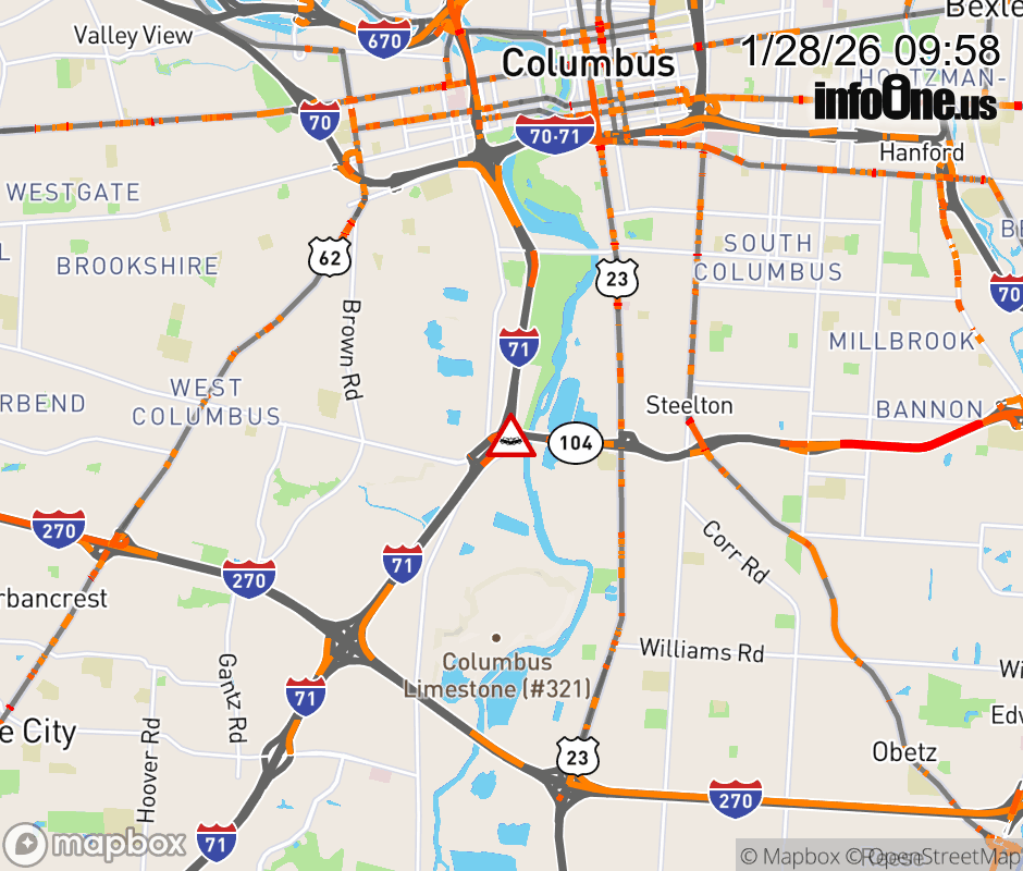 All lanes are closed on SR-104 West at US-33 all lanes are closed on SR-104 East at I-71, due to a crash. Updated: Wed 1/28/26 9:58 AM EST ![]() Updated: Wed 1/28/26 9:58 AM EST |