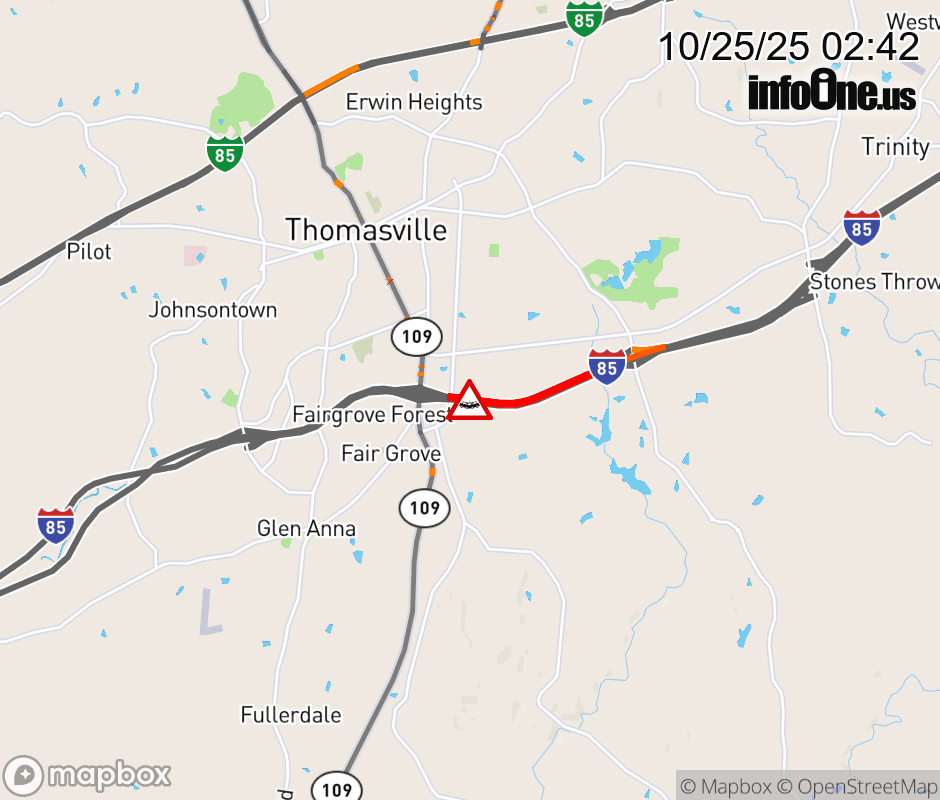 Two lanes are closed near Exit 103 (NC 109). Updated: Sat 10/25/25 2:42 AM EDT ![]() Updated: Sat 10/25/25 2:42 AM EDT |