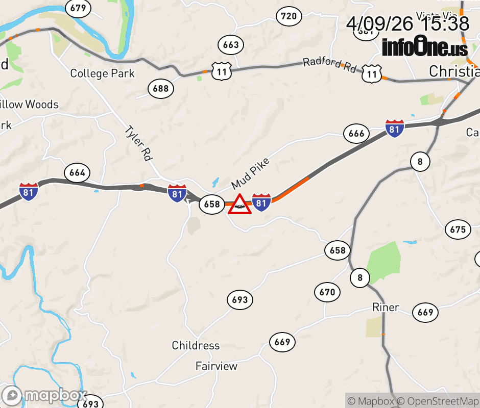 On I-81 at mile marker 110.3 in the County of Montgomery, motorists can expect delays due to a vehicle crash. The north left shoulder is closed. ![]() |
