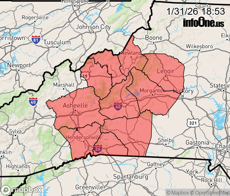 Canceled 2/1/26 1:50 AM Extreme Cold Warning issued January 31 at 6:51PM EST until February 1 at 1:00PM EST by NWS Greenville-Spartanburg SC * WHAT... For the Extreme Cold Warning, dangerously cold wind chills as low as 22 below expected. For the Wind Advisory, northwest winds 15 to 25 mph with gusts up to 55 mph expected. * WHERE... Avery, Buncombe, Henderson, Mitchell, and Yancey Counties, plus mountainous western portions of Burke, Caldwell, McDowell, Polk, and Rutherford counties. * WHEN... Until 1 PM EST Sunday. * IMPACTS... Gusty winds will blow around unsecured objects. Tree limbs could be blown down and a few power outages may result. The dangerously cold wind chills as low as 20 below zero could cause frostbite on exposed skin in as little as 30 minutes. Frostbite and hypothermia will occur if unprotected skin is exposed to these temperatures. Pets and livestock will be endangered by extreme cold if left unprotected for extended periods. ![]() |