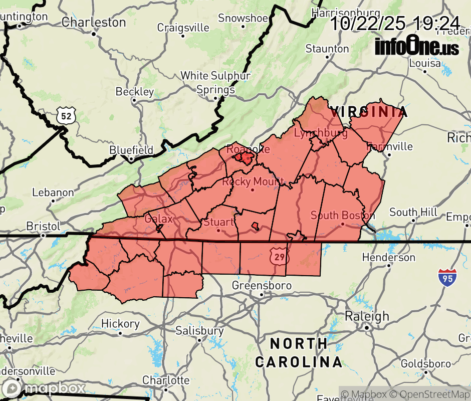 Canceled 10/23/25 6:00 AM Special Weather Statement issued October 22 at 7:21PM EDT by NWS Blacksburg VA Dry and windy conditions are expected for Thursday. Relative humidities during the afternoon will fall into the 25 to 30 percent range across portions of northwest North Carolina, the Piedmont of Virginia, and portions of the New River Valley. Wind gusts of 20 mph to 30 mph are also expected through late morning into early evening. These conditions, combined with dry fuels such as fallen leaves and dead brush, will result in increased threat of any fires burning out of control across northwest North Carolina and portions of the Piedmont and New River Valley regions of Virginia. Outdoor burning is strongly discouraged. Please consult your local burn permitting authorities as to whether burning is allowed on Thursday. ![]() |