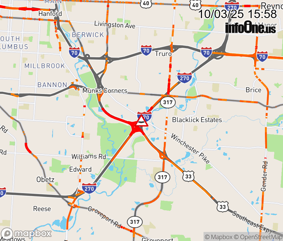 The right shoulder is blocked on I-270 South at US-33 West, due to a crash. Updated: Fri 10/3/25 3:58 PM EDT ![]() |