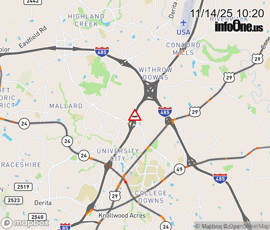 The two left lane is closed past Exit 46 (Mallard Creek Church Rd.). Updated: Fri 11/14/25 10:20 AM EST ![]() Updated: Fri 11/14/25 10:20 AM EST |