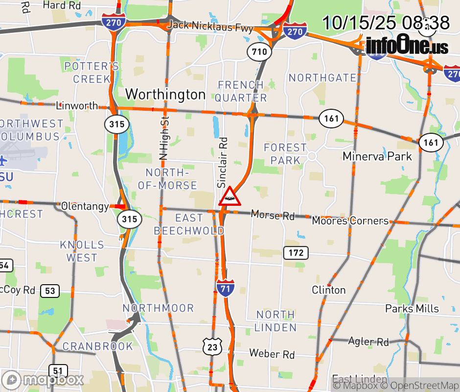 The left lane is blocked on I-71 South at Sinclair Rd/Morse Rd, due to a crash. Updated: Wed 10/15/25 8:38 AM EDT ![]() Updated: Wed 10/15/25 8:38 AM EDT |