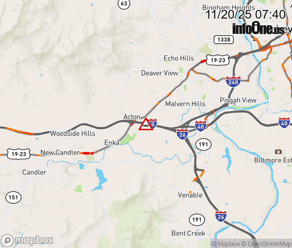 The right lane is closed after Exit 44, US 19, (Smokey Park Highway). ![]() |