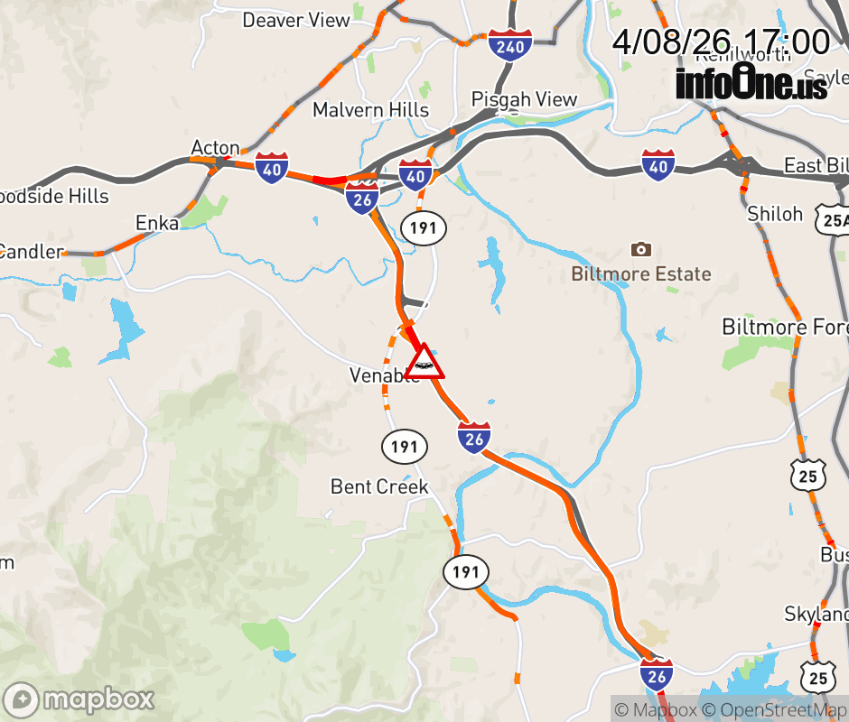 The left shoulder is closed past Exit 33, NC 191, (Brevard Road). Updated: Wed 4/8/26 5:00 PM EDT ![]() Updated: Wed 4/8/26 5:00 PM EDT |