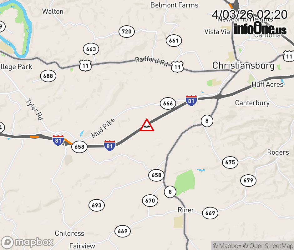 On I-81 at mile marker 112 in the County of Montgomery, motorists can expect delays due to a tractor trailer crash. The north left shoulder and left lane are closed. Updated: Fri 4/3/26 2:20 AM EDT ![]() Updated: Fri 4/3/26 2:20 AM EDT |