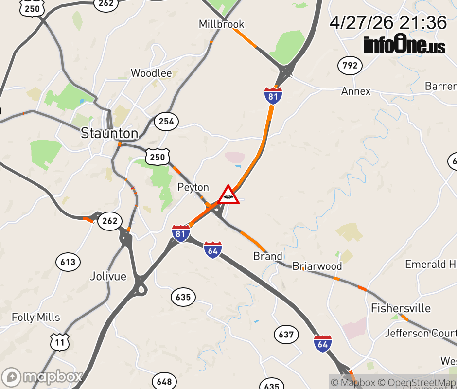 On I-81 at mile marker 223 in the County of Augusta, motorists can expect delays due to a tractor trailer crash. The south right shoulder is closed. Updated: Mon 4/27/26 9:36 PM EDT ![]() Updated: Mon 4/27/26 9:36 PM EDT |