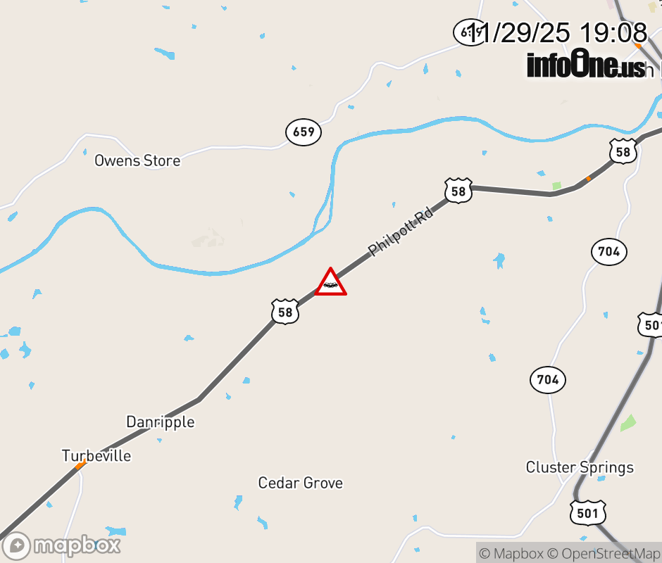 On US-58 East in the County of Halifax, in the vicinity of Rt. 703E/W (Halifax County), motorists can expect delays due to a vehicle crash. Lane closures exist. ![]() |