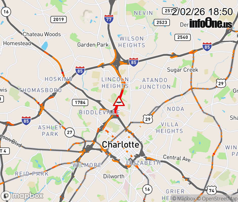 Crash on I-77 North Bound between exit 11, I-277/Brookshire Frwy and exit 12, La Salle St. The right general purpose lane is blocked. Updated: Mon 2/2/26 6:50 PM EST ![]() Updated: Mon 2/2/26 6:50 PM EST |