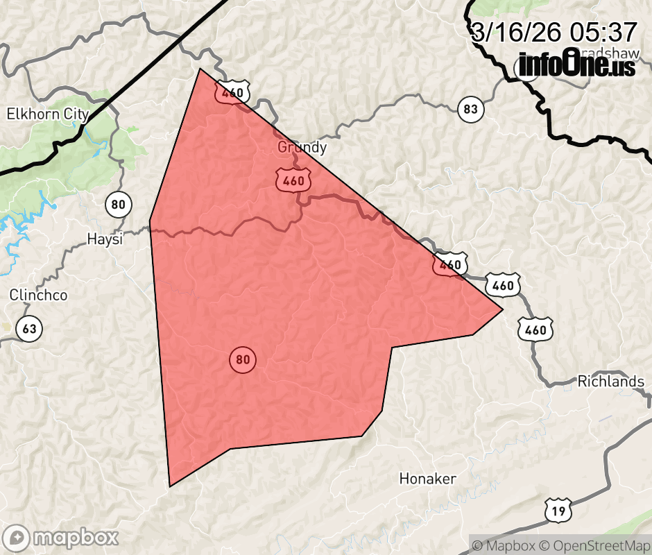 Canceled 3/16/26 5:45 AM Severe Thunderstorm Warning issued March 16 at 5:36AM EDT until March 16 at 5:45AM EDT by NWS Charleston WV At 536 AM EDT, a severe thunderstorm was located near Grundy, moving northeast at 50 mph. HAZARD...60 mph wind gusts. SOURCE...Radar indicated. IMPACT...Expect damage to roofs, siding, and trees. Locations impacted include... Grundy, Davenport, Oakwood, and Vansant. ![]() |