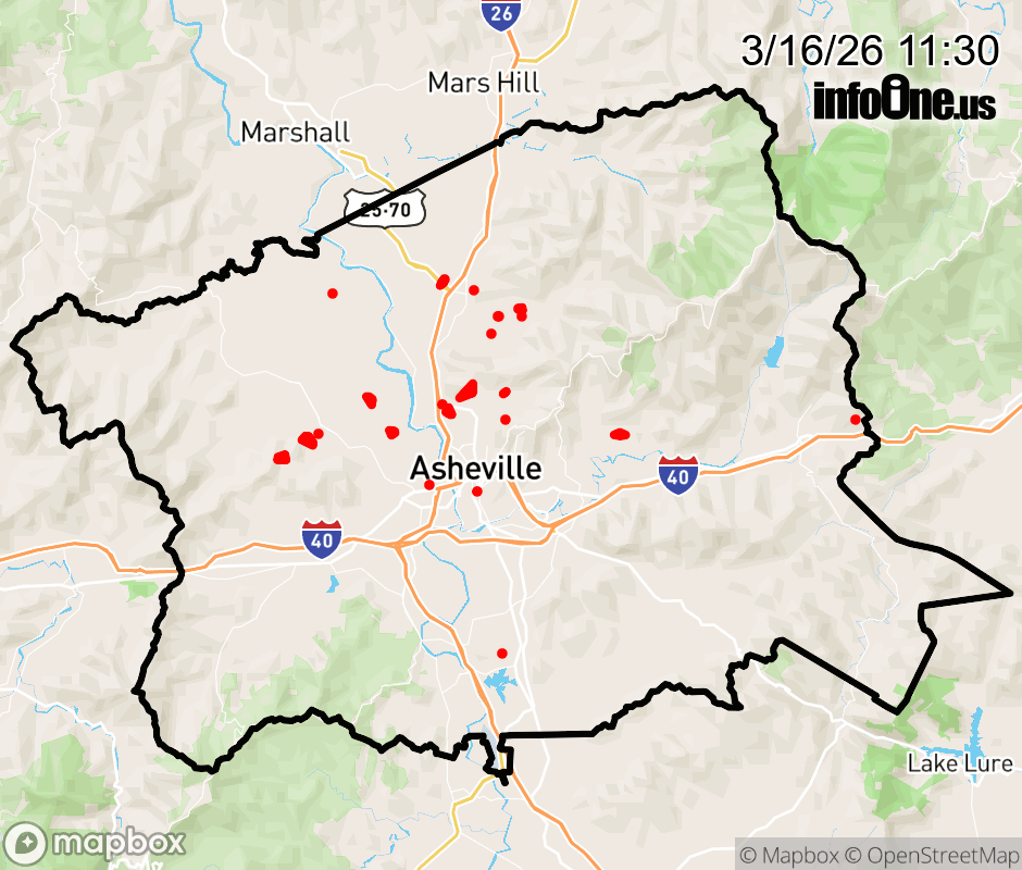 Buncombe County has 28 power outages affecting 182 customers. Duke Energy 182 without power Estimated repair: Mon 3:00 PM Updated: Mon 3/16/26 11:30 AM EDT ![]() Updated: Mon 3/16/26 11:30 AM EDT |